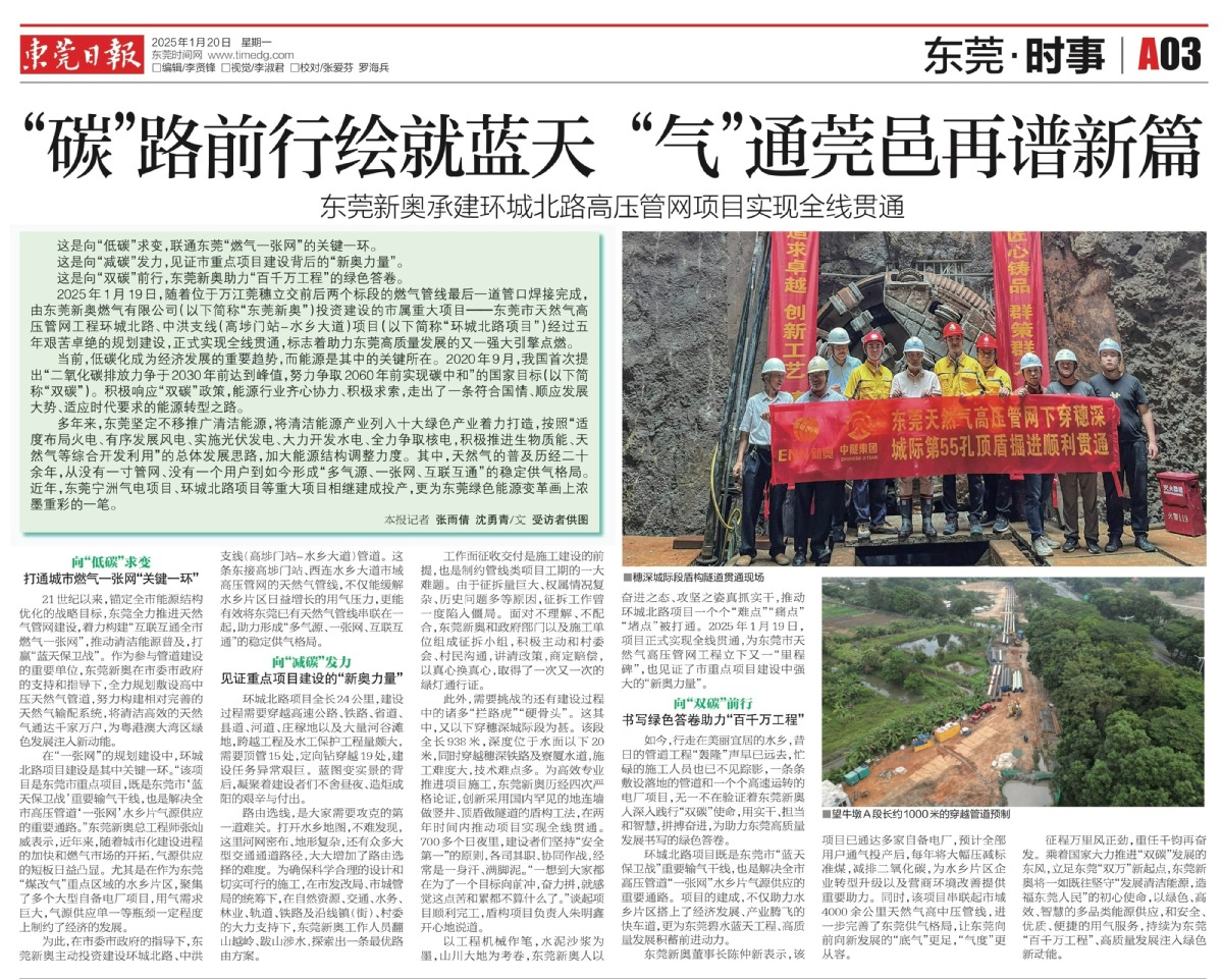 以工程機(jī)械作筆,水泥沙漿為墨,山川大地為考卷,東莞新奧人以奮進(jìn)之態(tài)、攻堅之姿真抓實干,推動環(huán)城北路項目一個個“難點”“痛點”“堵點”被打通。2025年1月19日,項目正式實現(xiàn)全線貫通,為東莞市天然氣高壓管網(wǎng)工程立下又一“里程碑”,也見證了市重點項目建設(shè)中強(qiáng)大的“新奧力量”。