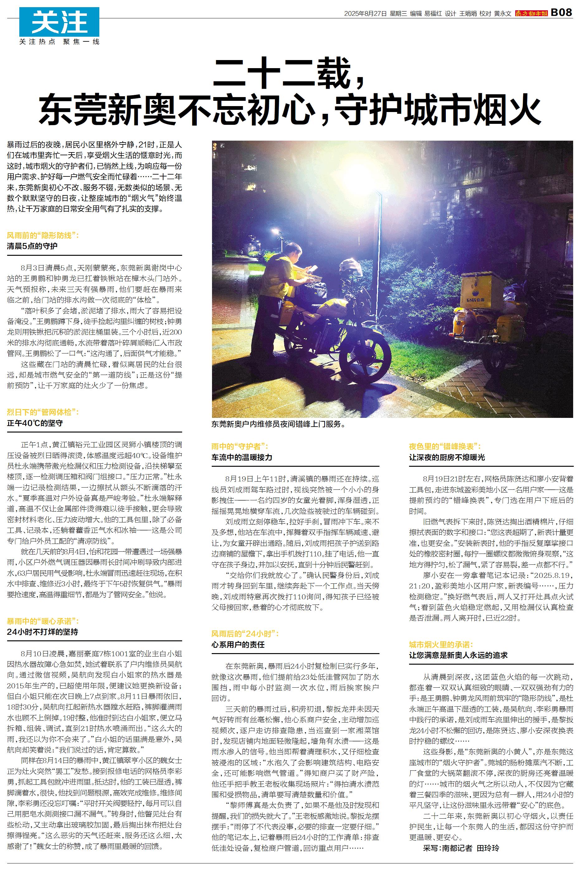 就在幾天前的8月4日,怡和花園一帶遭遇過一場強暴雨,小區戶外燃氣調壓器因暴雨長時間沖刷導致內部進水,63戶居民用氣受影響,杜永端冒雨迅速趕往現場,在積水中排查、維修近3小時,最終于下午5時恢復供氣?!氨┯暌獡屗俣?,高溫得重細節,都是為了管網安全。”他說。
