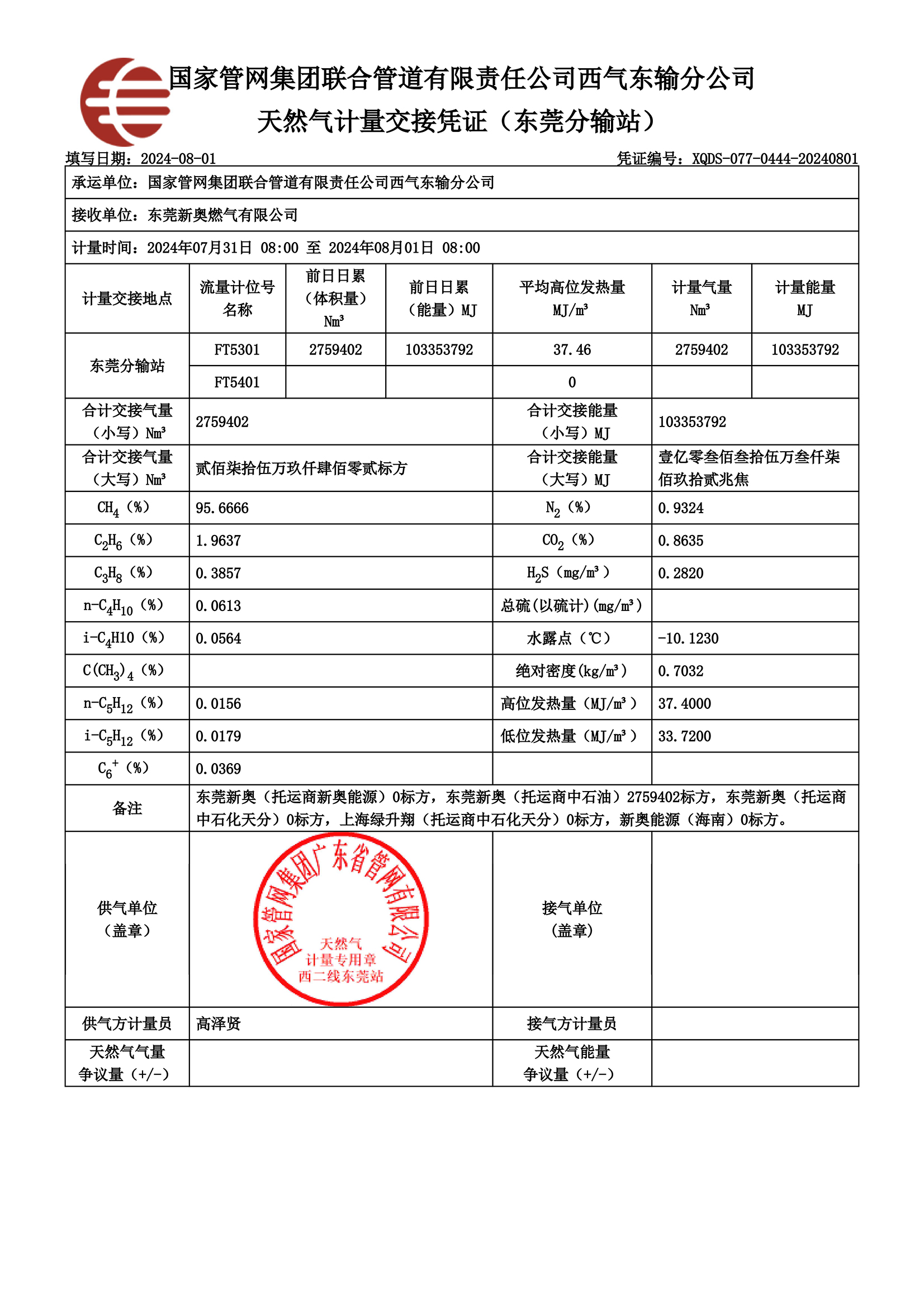 東莞新奧燃氣2024年8月份供氣質(zhì)量檢查報告公示
